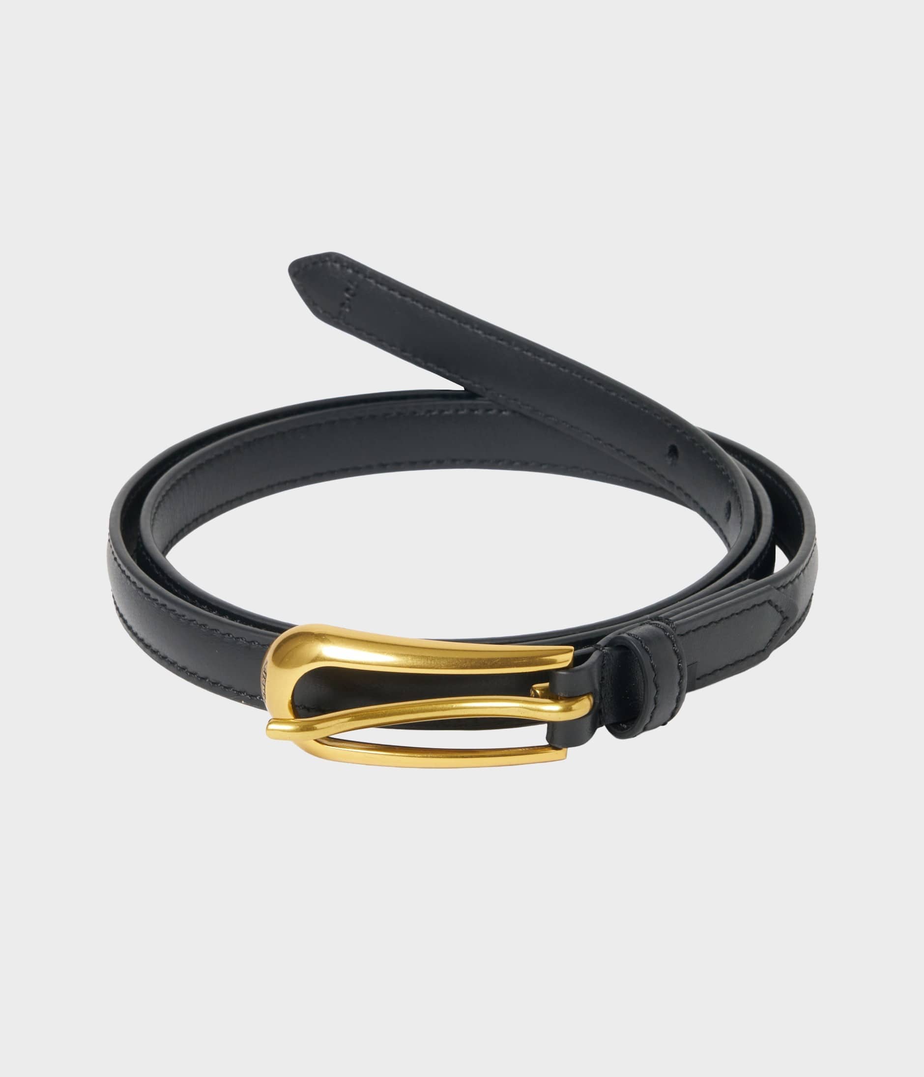 "ツイスト"バッグのメタルパーツと同じペアシェイプ(洋ナシ型)のバックルが特徴のベルト。